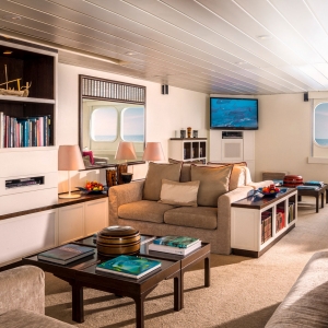 The indoor lounge is the perfect place to unwind, swapping stories with fellow passengers, reviewing the day’s underwater highlights captured by the resident videographer, or enjoying a book, magazine or board game from the Library along with all-day drinks and refreshments.