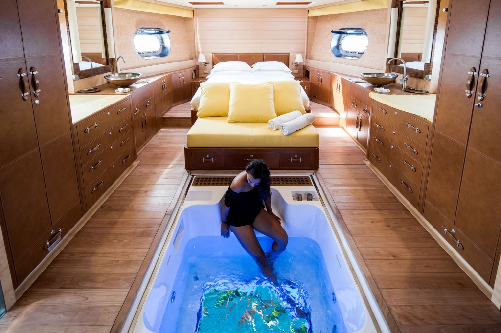 The ultra-indulgent yacht has a maximum occupancy of four adults and two children to provide the ultimate sense of exclusivity and privacy whilst offering intelligent luxury of the highest international standard. The boat features a spacious master suite with a glass-bottomed spa tub and an en-suite