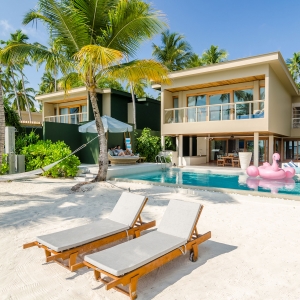 Get your dose of 'vitamin sea' in a huge beach haven on the glittering sand. Watch coconut palms sway while you recline on the shore next to your private pool. In seconds you're at the entrance to the house reef.
