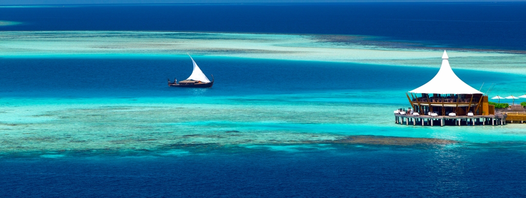 An icon in the Maldives, The Lighthouse Restaurant rises over the lagoon, its towering white sail a beacon on the seas.