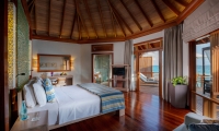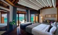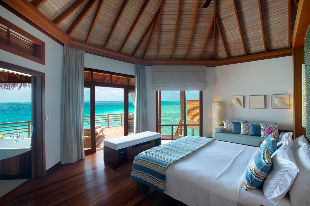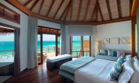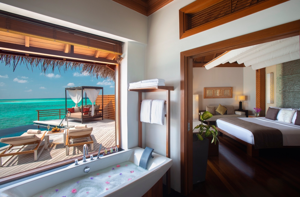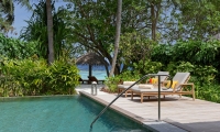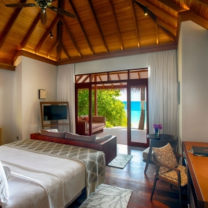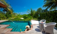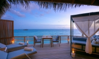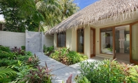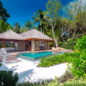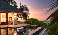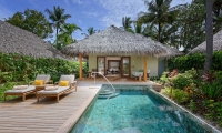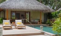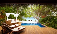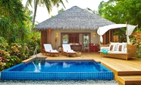 A winding pathway through the lush foliage leads to these exclusive Suites, which feature wooden floors and high ceilings in a traditional Maldivian concept. At the foot of the king-size bed is an ottoman concealing a television screen while on one side there is a work desk and on the other, a cosy reading nook. In the adjoining lounge, there is a 55” television with access to movies and Internet and a sublimely cosy sofa for relaxation. Sliding glass doors open on to an expansive wooden deck ideal for sunbathing or private dining under the stars beside 19ft x 10ft swimming pool (which has a hot and cold Jacuzzi) adorned with fibre optic lights for a magical ambience in the evening.