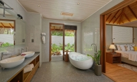 Inside, a separate bedroom and living room give you all the space you need to feel at home, while an expansive bathroom pampers you with luxurious amenities. You've got designer toiletries, an indoor shower, a deep free-standing tub and an outdoor shower with palms overhead and plants at your feet.