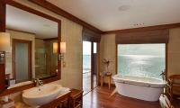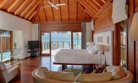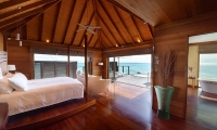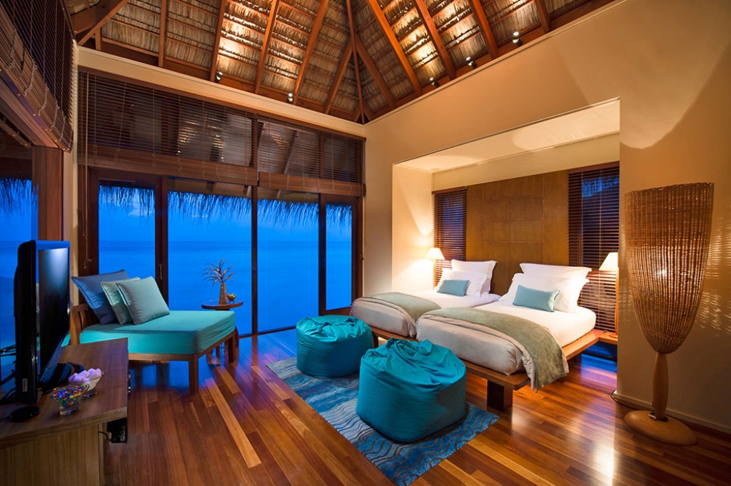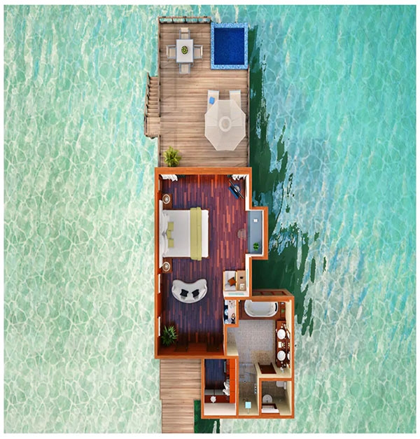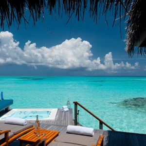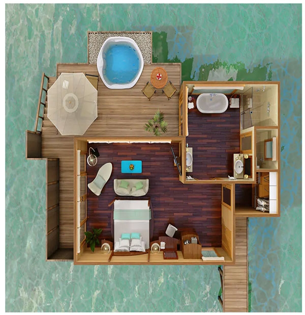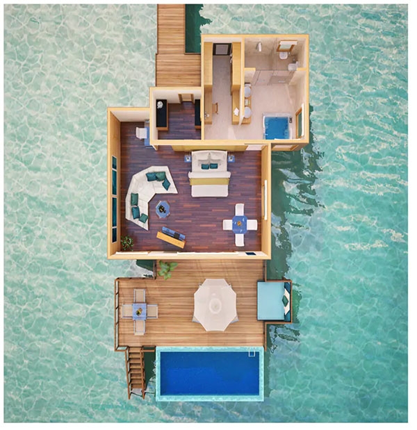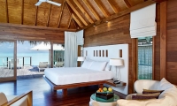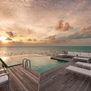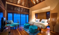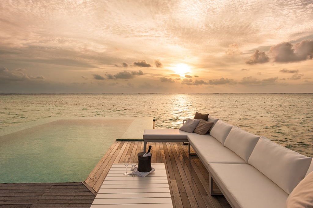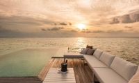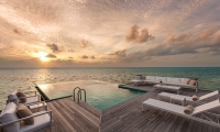 Set on stilts above the ocean, the premier villa offers a sundeck with a private infinity pool and sunset views. The luxury bathroom features an ocean-facing whirlpool tub.