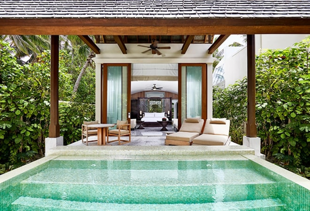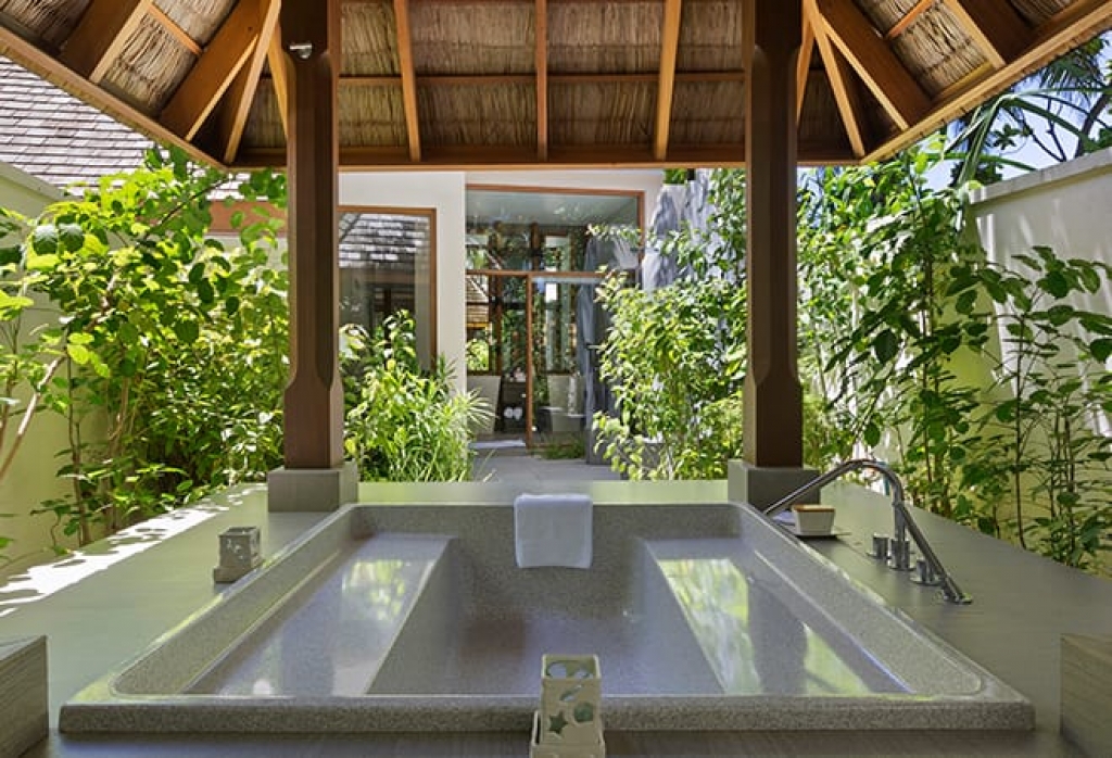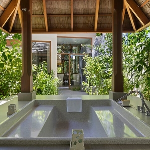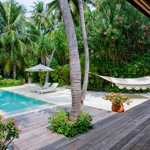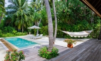 The deluxe beach villa, found on the livelier Rangalifinolhu Island, features a private garden, plunge-pool and an abundance of space illuminated by floor-to-ceiling windows. The outdoor bath can be filled upon request for a luxurious bathing ritual.