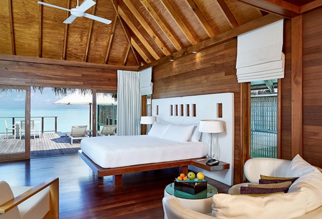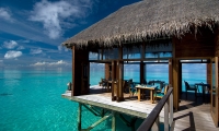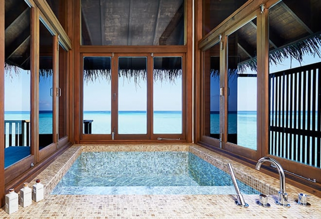 Winner of the “Maldives Leading Water Villa Resort 2016” title, this Rangali Island villa features a private sun terrace – complete with plunge-pool and stairs leading directly into the Indian Ocean and an ocean-facing tub.