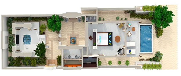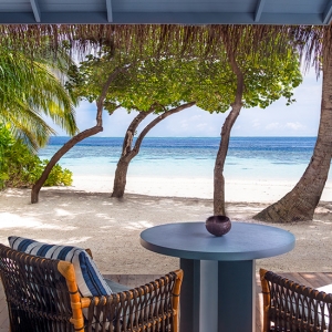 Located on Rangalifinolhu Island, step directly onto the beach. The extended space gives the option to create a second curtained-off bedroom. Your outdoor bath can be filled upon request for a luxurious bathing ritual.