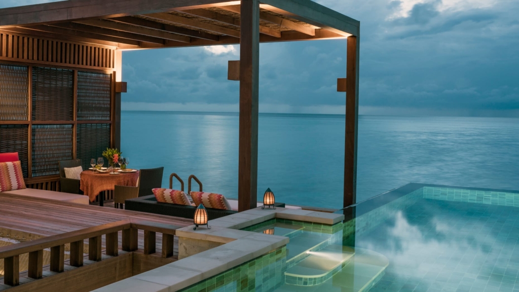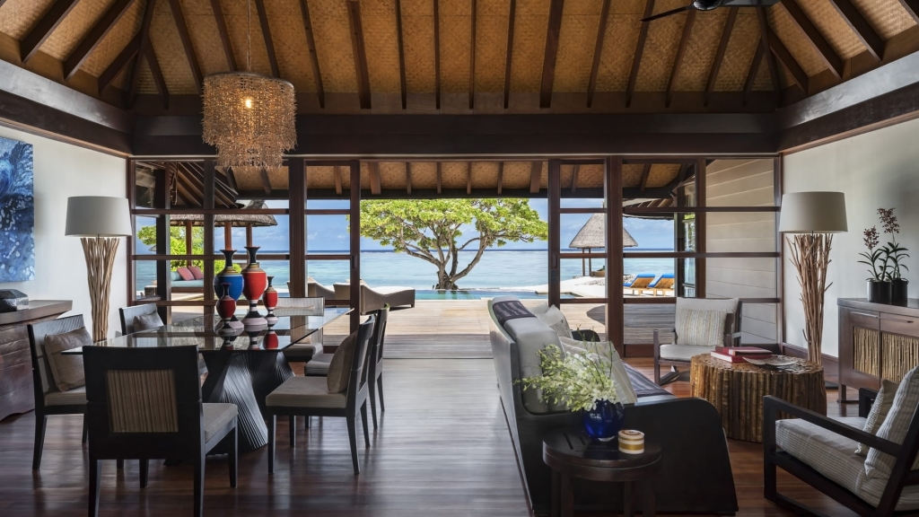 A palatial ocean-top retreat complete with dramatically extended deck, large infinity pool with sun platform, shaded lounge, al fresco showers and over-water hammocks. And that’s just the outside.
