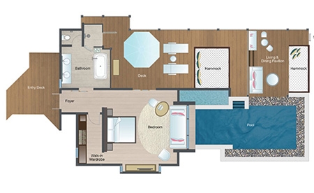 Dive from your bedroom straight into the infinity pool. Lounge on overwater hammocks. Bathe in sunset blues at the water’s edge living and dining pavilion. Descend the steps directly into the warm crystal lagoon, dotted with reef fish and corals.