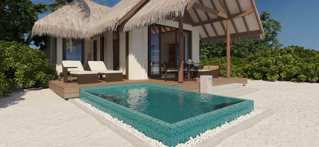 The enchanting Pool Beach Villa is our signature accommodation and comes with a private pool complete with sun loungers. This Maldives pool villa features direct beach access perfect for a refreshing dip in the dazzling waters of the Indian Ocean.