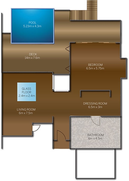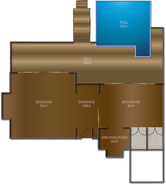 The Deluxe Water Villa with Pool is split into two sections, with the master bedroom on one side and the bathroom on the opposite site, separated by an entrance area. The large outside deck spans the whole length of the villa.