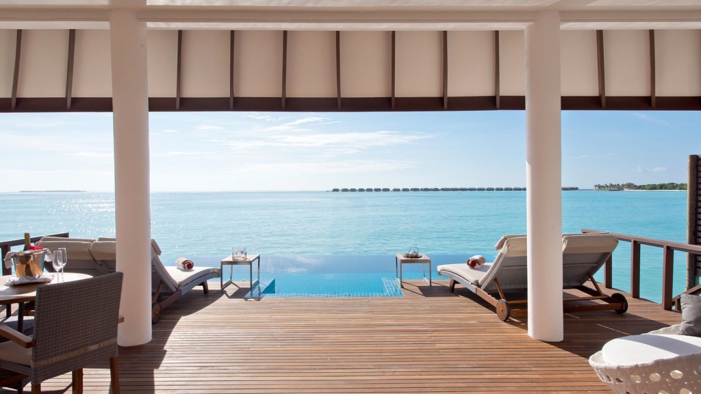 Built upon wooden stilts above the shimmering turquoise lagoon, and with floor to ceiling windows that make the most of the unforgettable panoramic Maldivian views.