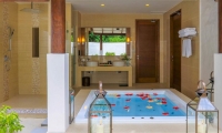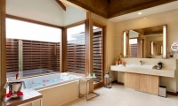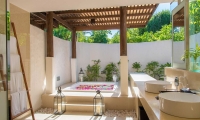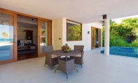 The villa has a separate dining and living area, as well as a very spacious bathroom, complete with a jacuzzi bathtub. Situated between the villa and its private beach is a 40m2 pool.