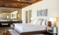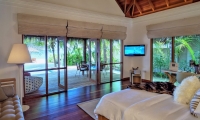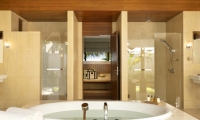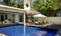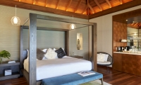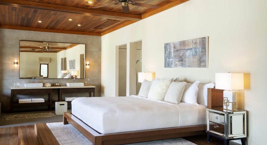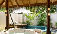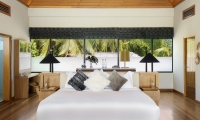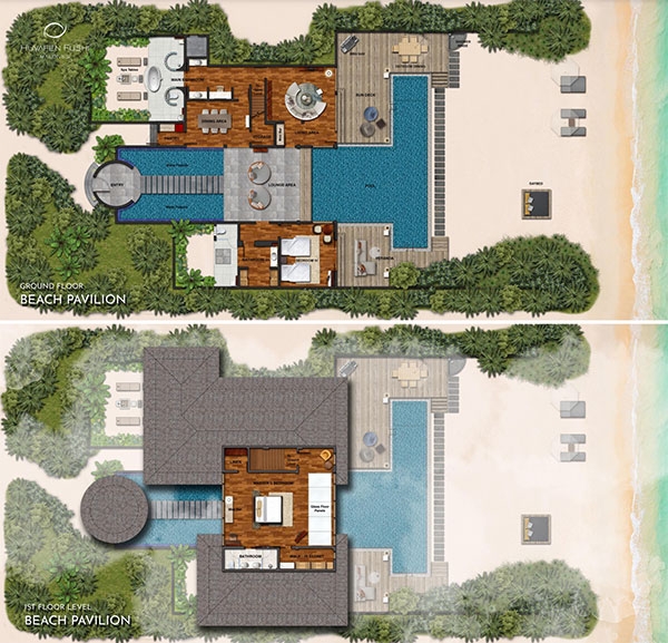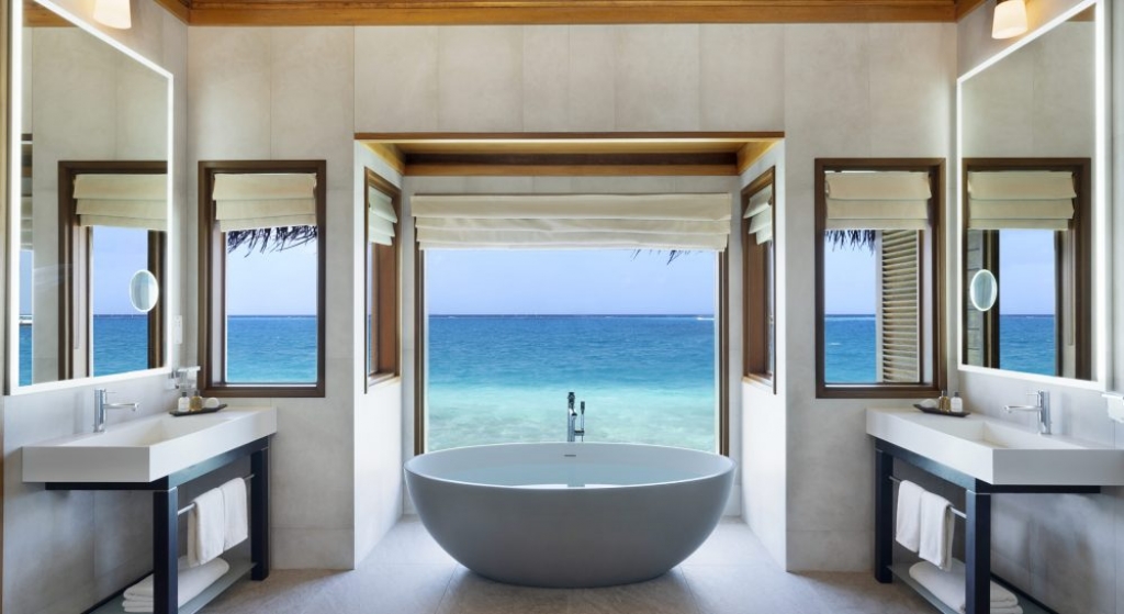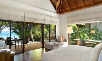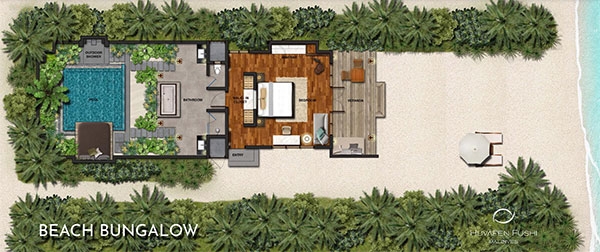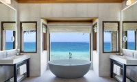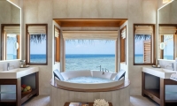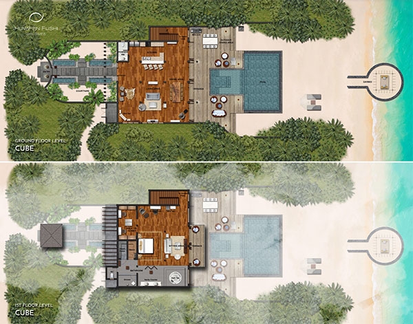 Avant-garde design. A private slice of beach. An elevated master bedroom with glass floors – your view to an illuminated infinity pool and tranquil lagoon. A lithe staircase descends from the inner chamber to the outer oasis. An open-air rain shower in your own private garden, an oversized bath to sink into. An indoor bathroom off the main bedroom, a sanctuary inside a sanctuary.