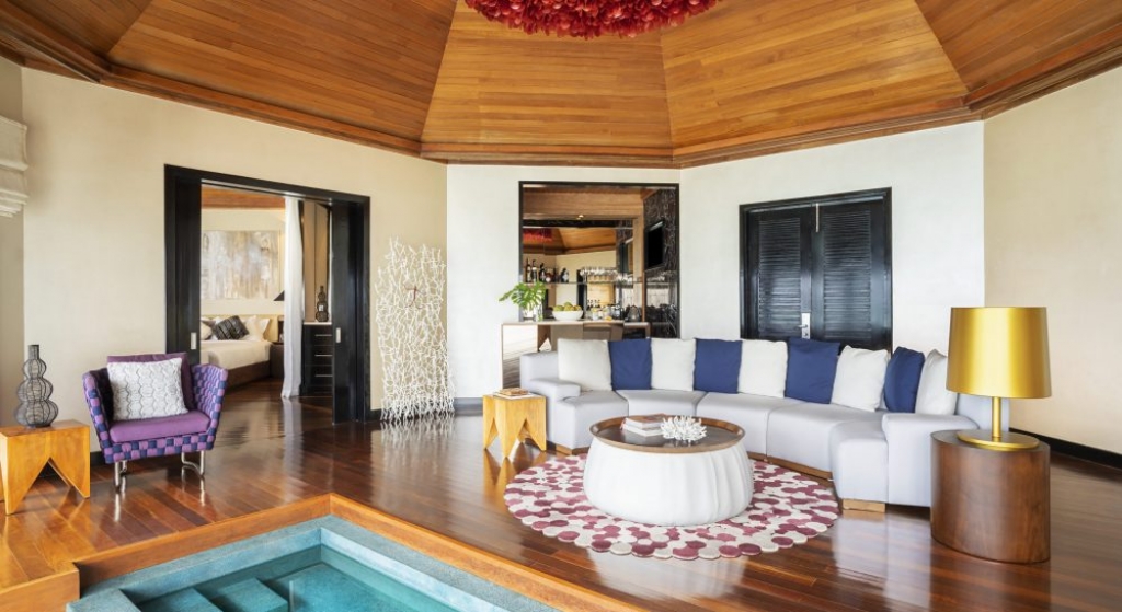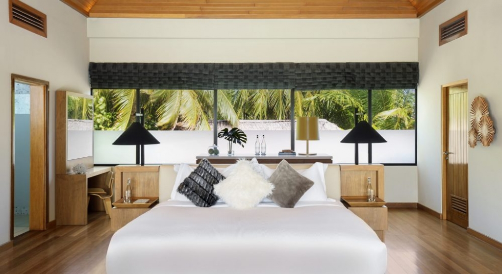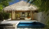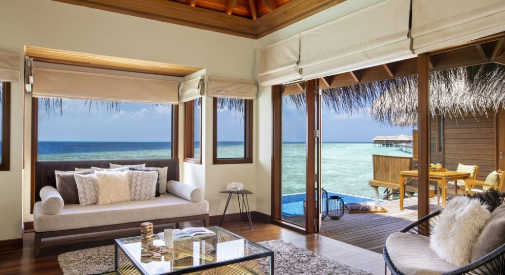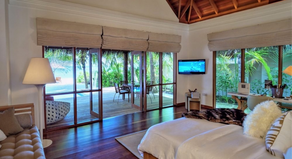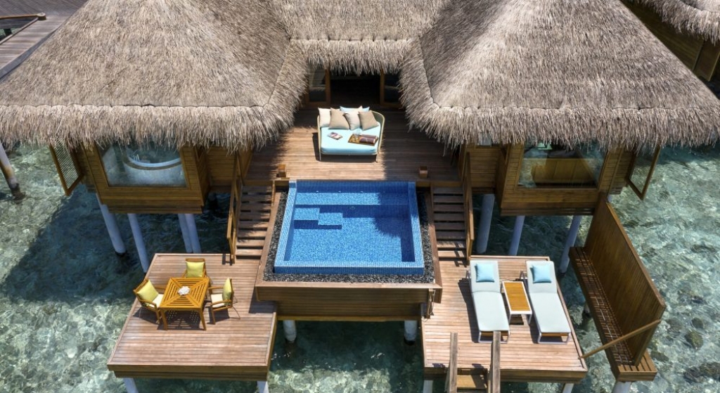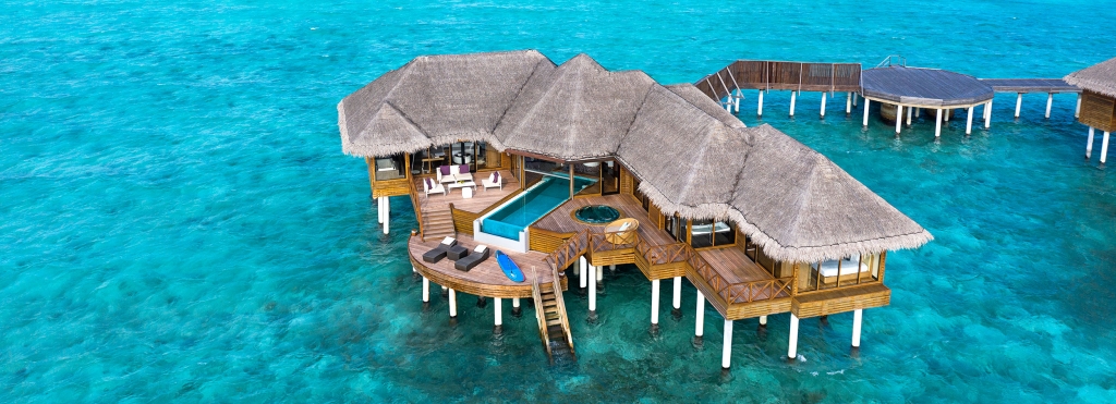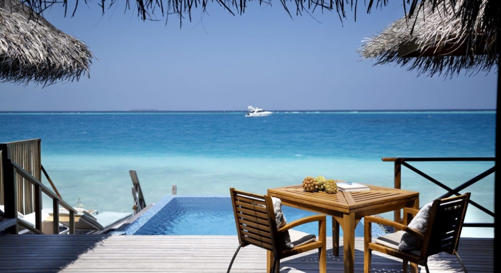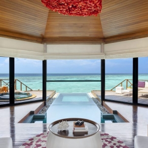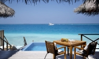Bold design. Two-bedroom pavilions centre on a freshwater swimming pool. Its infinity edge mimics the horizon. Yawns along with the vast Indian Ocean. The pool spans indoor and outdoor spaces, stretching from the private deck to the living room. Both shaded and exposed. An outdoor Jacuzzi illuminated with fibre-optic lights also perches on the deck.