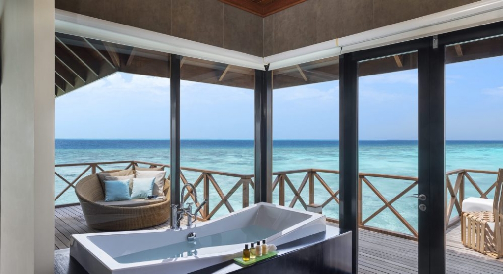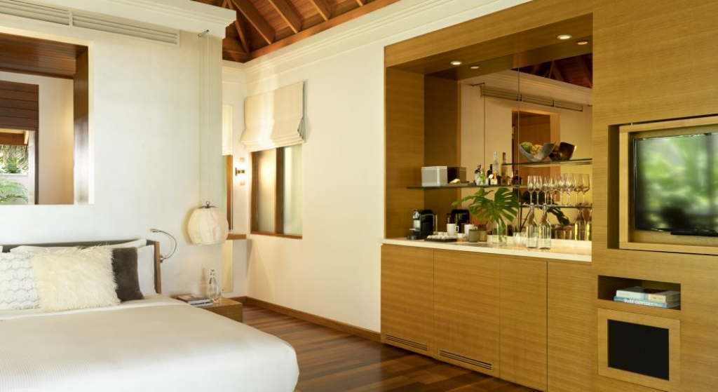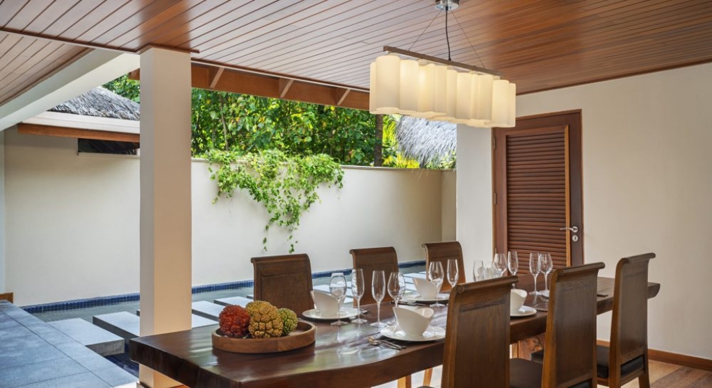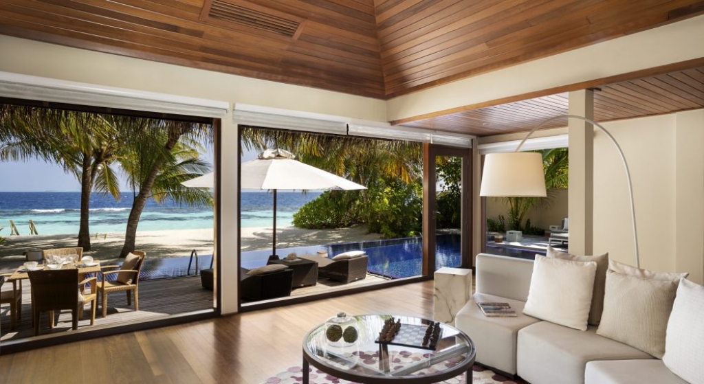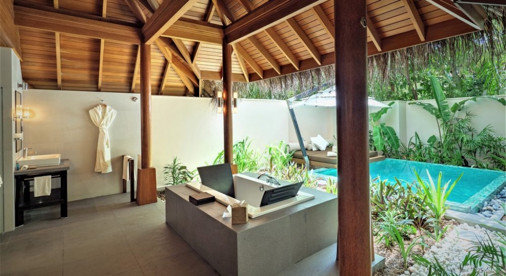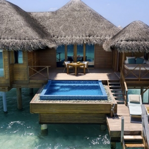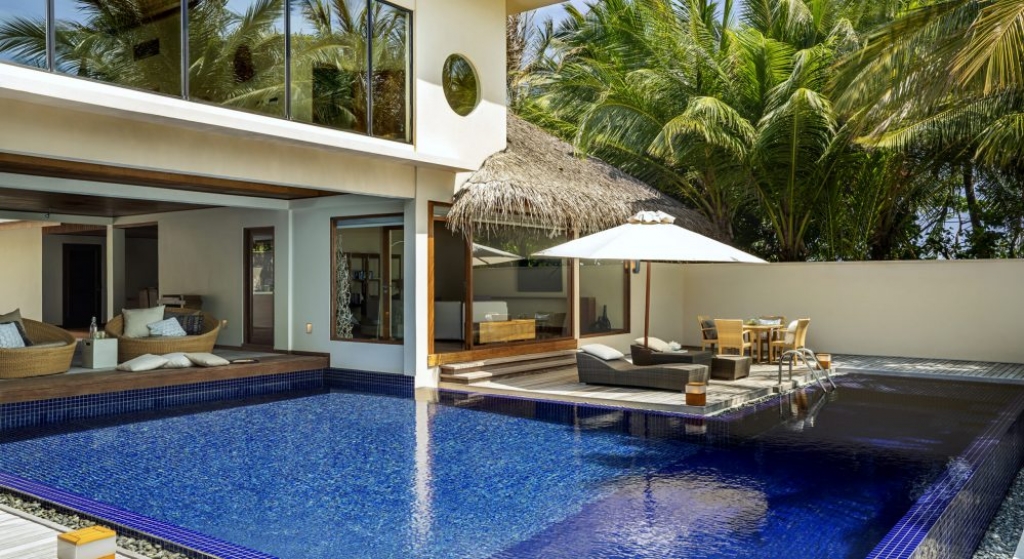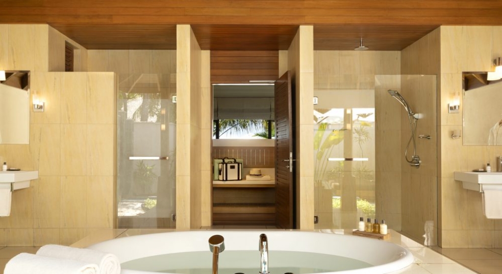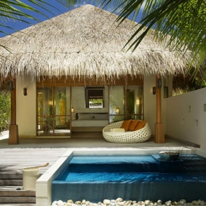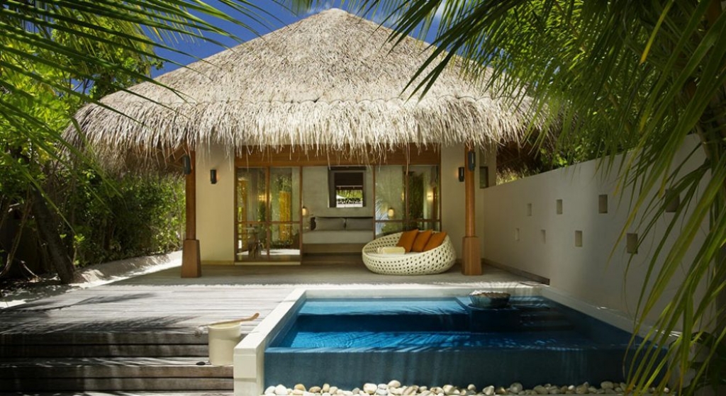 Bold design. Two-bedroom pavilions centre on a freshwater swimming pool. Its infinity edge mimics the horizon. Yawns along with the vast Indian Ocean. The pool spans indoor and outdoor spaces, stretching from the private deck to the living room. Both shaded and exposed. An outdoor Jacuzzi illuminated with fibre-optic lights also perches on the deck.