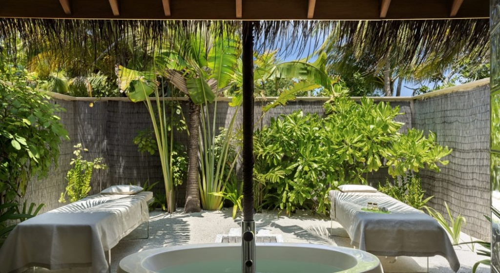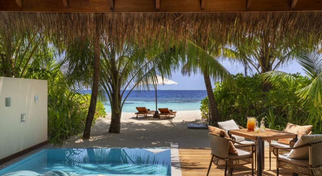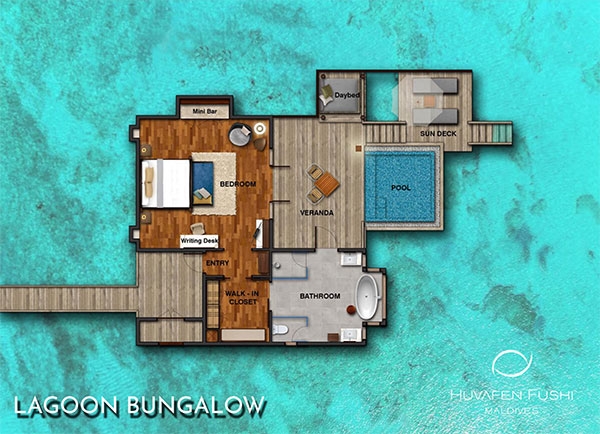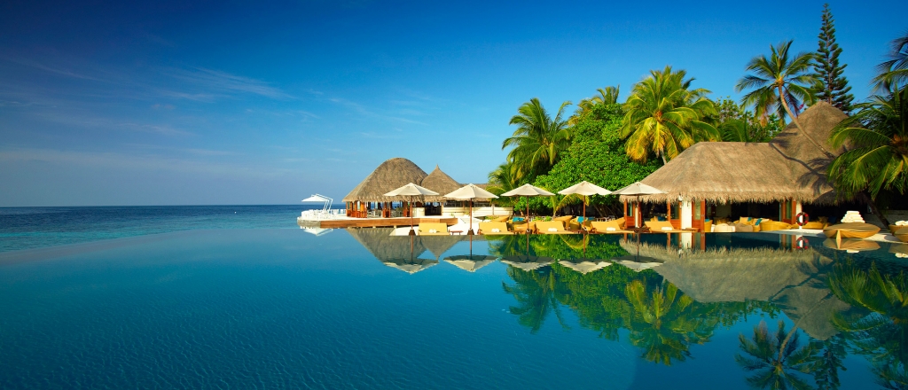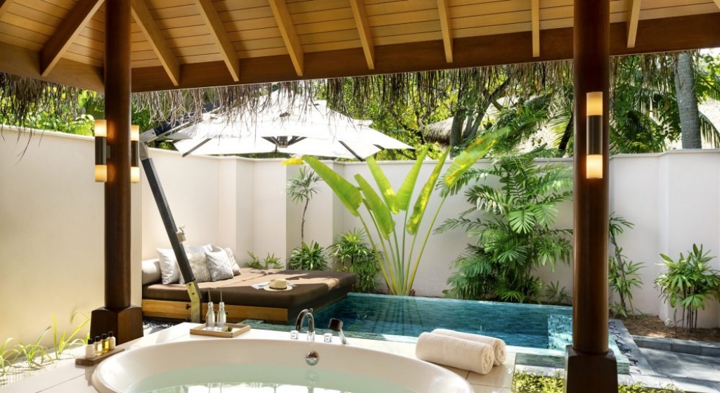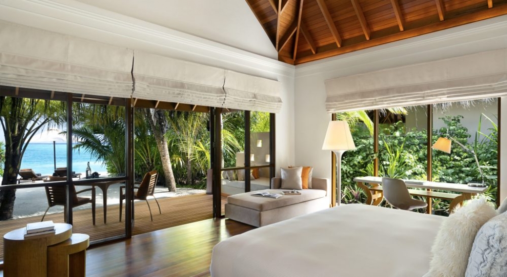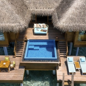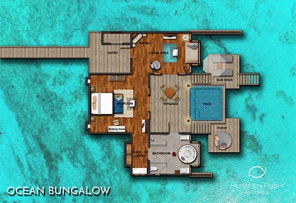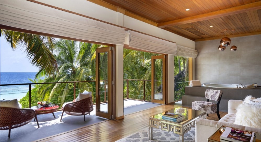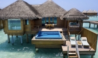 Bold design. Two-bedroom pavilions centre on a freshwater swimming pool. Its infinity edge mimics the horizon. Yawns along with the vast Indian Ocean. The pool spans indoor and outdoor spaces, stretching from the private deck to the living room. Both shaded and exposed. An outdoor Jacuzzi illuminated with fibre-optic lights also perches on the deck.