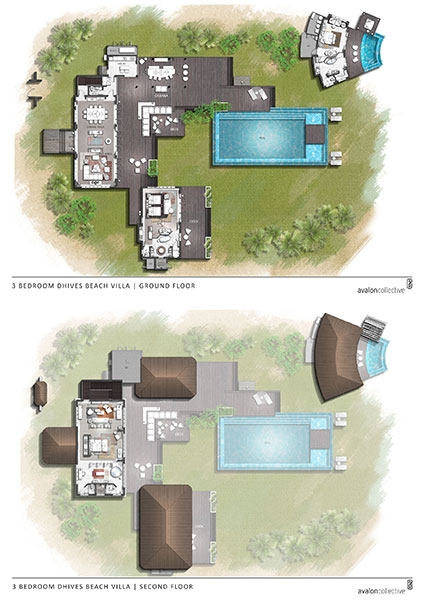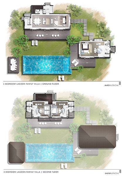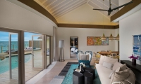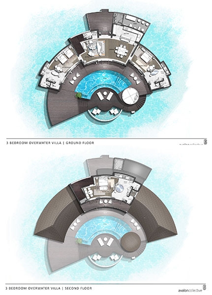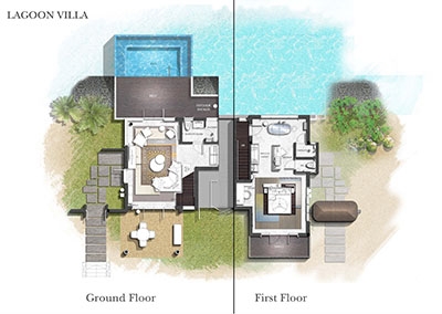 These 2 villas feature two separate bedrooms with one king bed and one sofa bed, two bathrooms, outdoor shower, spacious living area with powder room, sundeck and infinity plunge pool located over water and a terrace and balcony overlooking the lagoon.