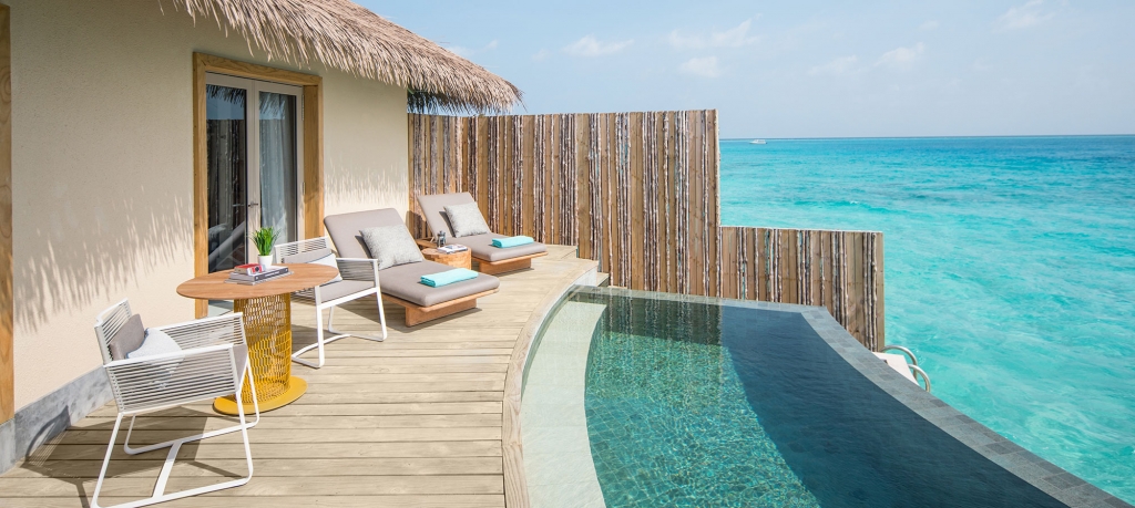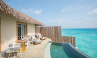 Split over two floors, the lagoon villas outdoor sundeck and infinity plunge pool are located over water with exquisite views of the ocean and direct access to the calm lagoon from the front of the villa.