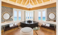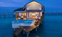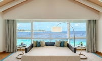 Spacious Overwater Pool Villas embrace the crystal blue waters and serenity of the Maldives in the modern design. Sliding doors from the bedroom open out onto the private decks creating an indoor/outdoor flow with Indian Ocean views and a bathroom equipped with a separate bathtub, indoor rain shower, and outdoor shower.