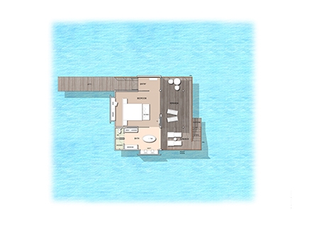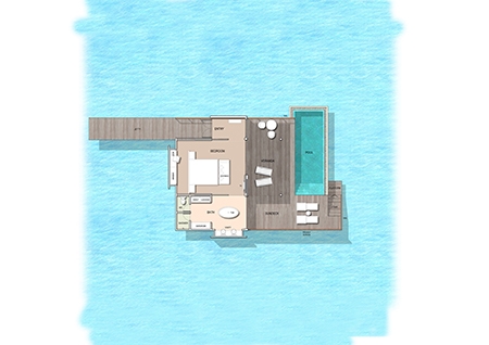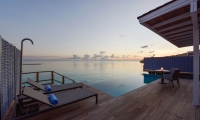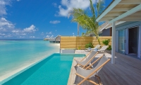 The Water Villas with Pool are located either in the crystal clear lagoon or facing the house reef, all featuring modern interiors similar to the Deluxe Water Villas. These villas also include a private pool (18sqm) overlooking the ocean.