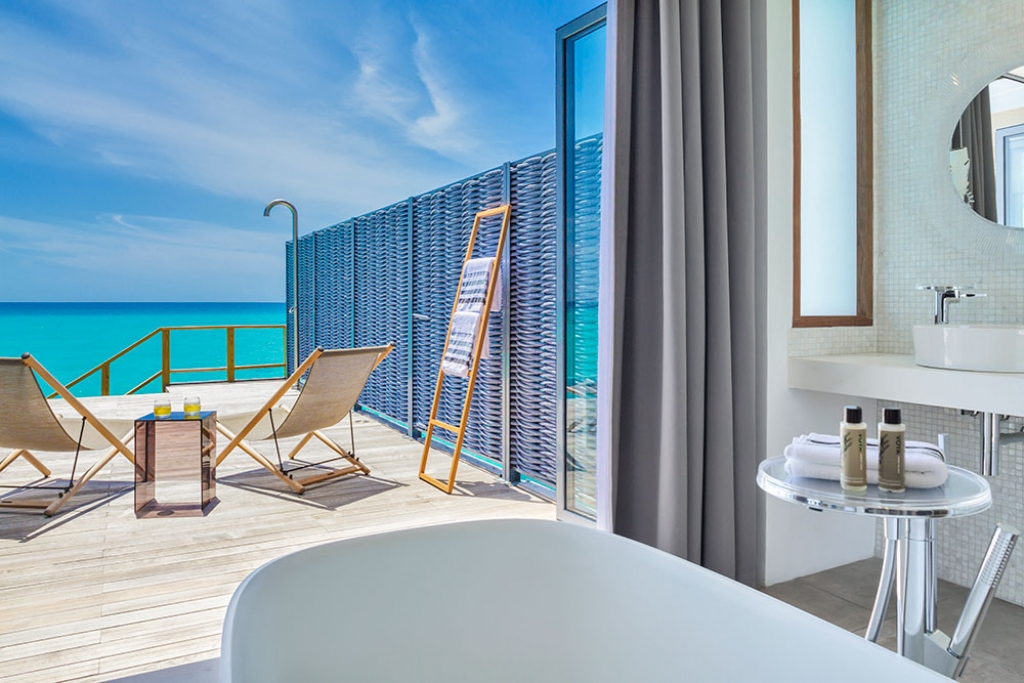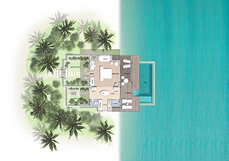 These magnificent villas are also built on stilts, close to the house reef with its colourful myriad of marine life. The villa features an airy bedroom with king bed and a spacious bathroom with twin vanities and rainfall shower. The villas also include an oversized two-tiered sundeck with your jacuzzi, sunloungers and sun umbrella. Enjoy panoramic views of the Indian Ocean with a bubbly drink in hand, and your favourite tunes playing the background.