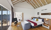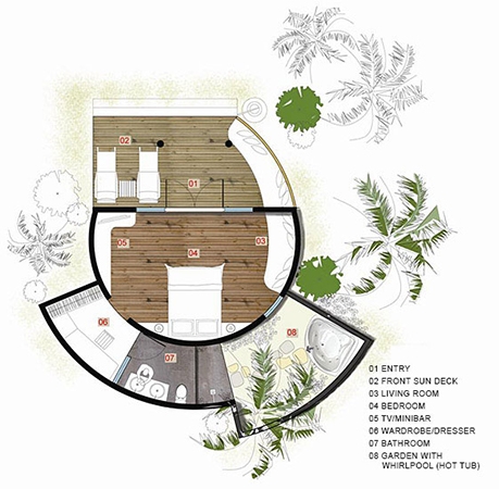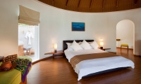 These villas are contemporary in design. Round in shape, the villa includes a wooden deck featuring an alluring built-in outdoor daybed and sunloungers. The bedroom is spacious and minimalist, displaying a modern king-sized low bed as the centrepiece. The open air bathroom leads to an outdoor jacuzzi