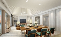 Designed for couples with unparalleled sunrise views over the Indian Ocean, the Temptation Pool Water Villa features 220 square meters of pure romance. A dedicated living space is framed by floor to ceiling windows infusing the villa with natural light. Outside, a spacious wooden deck terrace boasts a dining area and a cabana overlooking nothing less than a 14 meter infinity pool. Inside, sheer curtains adjacent to the marble-white Jacuzzi glass room freshen up the bedroom’s modern look surrounding a round shape master bed.