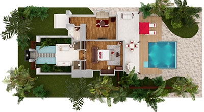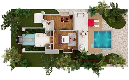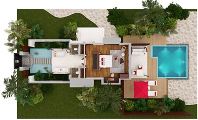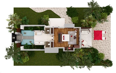 Two sumptuous bedrooms. A jungle-fringed deck. Lush. Lavish. Secluded. The perfect backdrop on which to design your days. Curl up with a book and green garden breezes, or venture into the ocean to snorkel and splash. Light up the night with a playful pool party, where the water comes alive with fibre optic lights and underwater speakers, or go low-key with surf-and-turf by starlight.