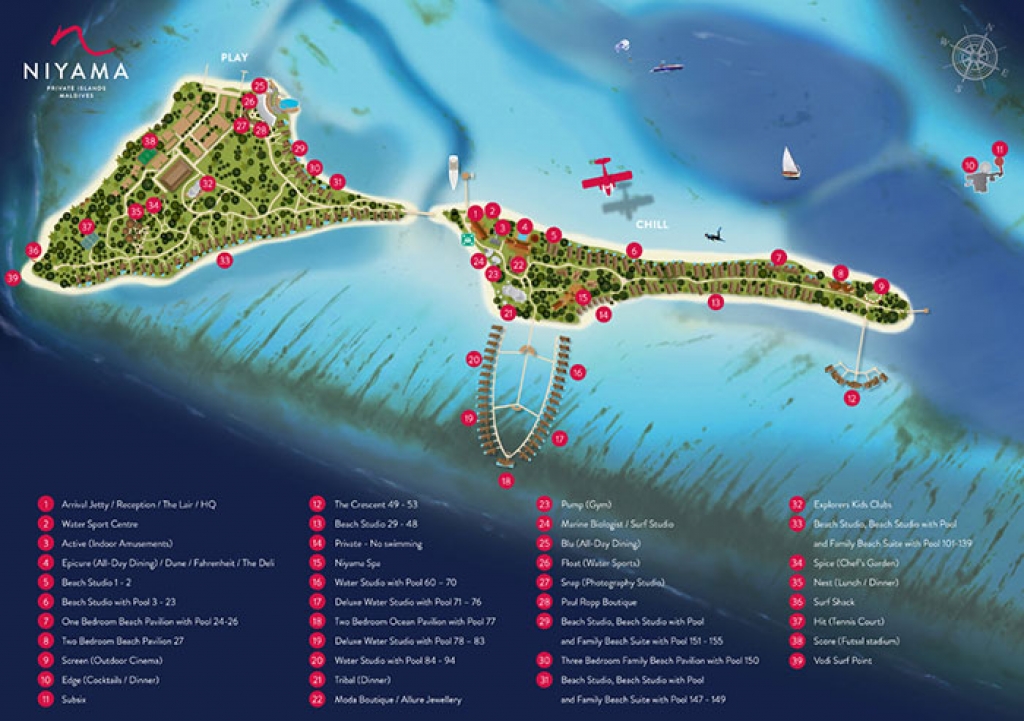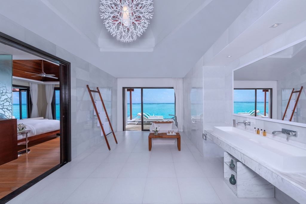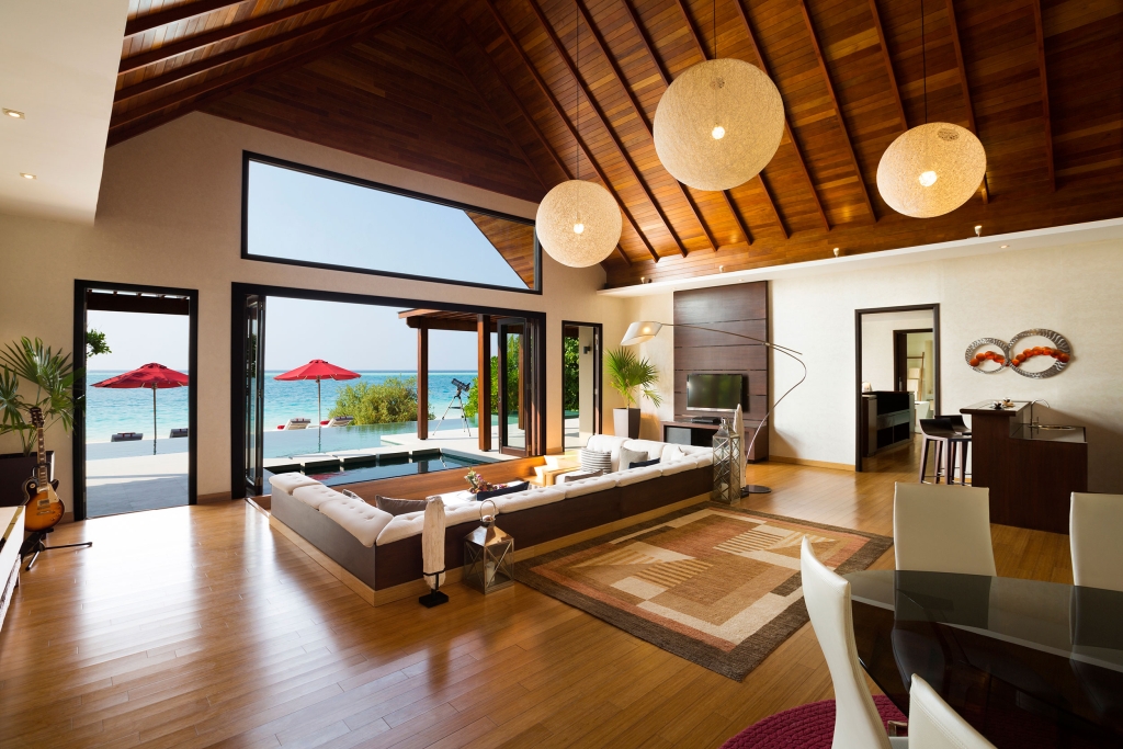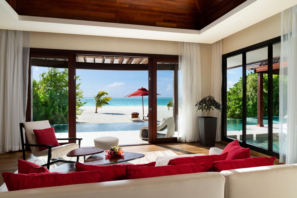 Inside, red accents explode amidst airy white interiors. High-tech toys and gourmet treats create an indoor playground, and the rain showers, your private waterfalls. For more, ring your personal Thakuru – your whim is our command.