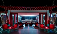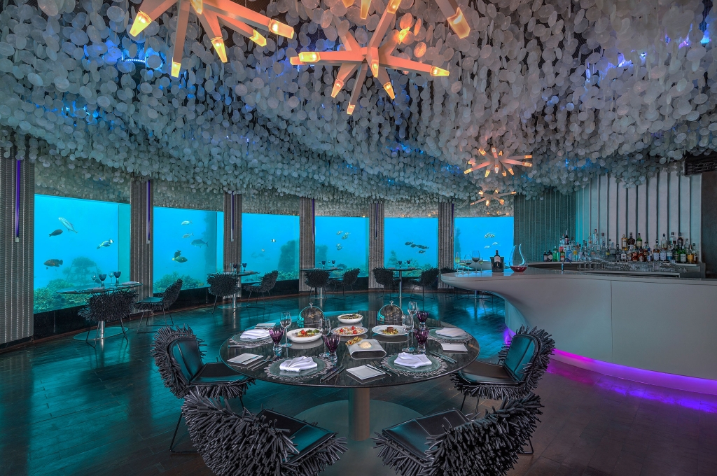 Reach Subsix by speedboat and descend a dramatic three-tier staircase. Italian abstract chandeliers illuminate the descent like shining coral. In the depths, hide away in the swooping curves of the clam-inspired bar, tucked into the soft anemone chairs beneath the soft waves of capiz shells draped from the ceiling.