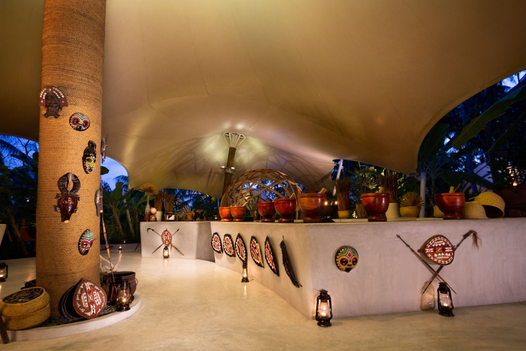 Welcome to the fireside, with a jungle canopy overhead and torches lighting the way. Here, the flavours of Africa, Central and South America are explored in the open kitchen.