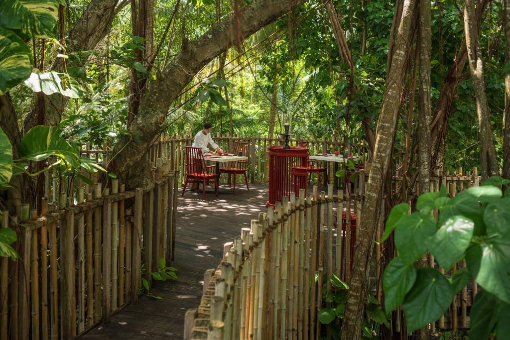 Explore the surreal six metres high or tucked between serpentine vines at the forest floor. For a theatrical meal, the teppanyaki table is the most desired in the house.