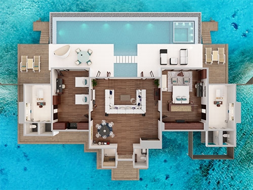 An over-water ocean haven with plenty of space to play. Wake to glimmers of dappled light on the lagoon and descend into its cool waters. Lounge on the deck. Plunge into your private pool by day and slip into your starlit Jacuzzi when night falls.