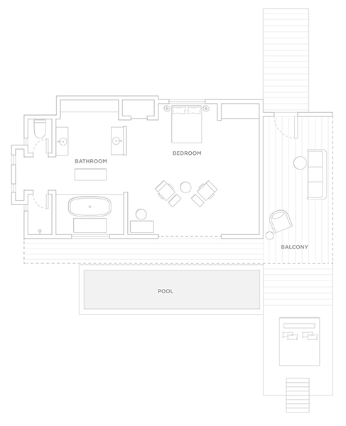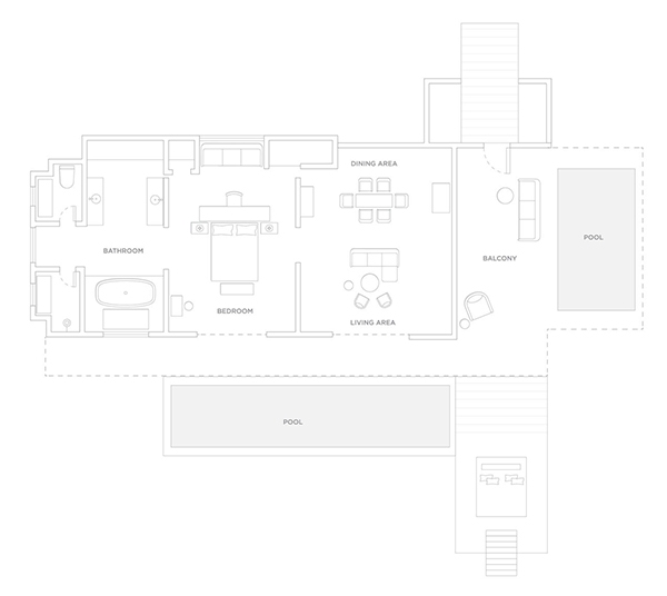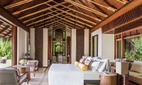 The large bedroom offers a king-size bed and stunning ocean views from the floor-to-ceiling windows, and a spacious, sun-drenched en suite with soaking tub. Through the wide villa doors, the airy, spacious layout invites long and lazy days lounging between your living room and sun-lit terrace.