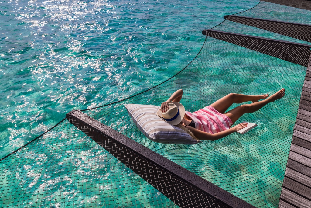 Your private infinity pool stretches from your private deck to the water's edge, offering a truly immersive stay at our Maldives resort. Unwind on the custom-built hammocks, the web of netting rocking you gently with the tropical breeze.