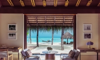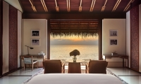Inside these stunning Water Villas in the Maldives, you'll find an airy bedroom with a king-size bed and floor-to-ceiling windows revealing immersive water-to-sky views. A separate living space for lounging and dining meets a wide-windowed bathroom, the elegant oversized tub offering its own breathtaking view of the tranquil waters beyond.