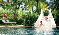 Discover wrap-around netted hammocks suspended just above the sparkling water on the split-level wooden deck that encases the villa and a coconut-thatched covered veranda.