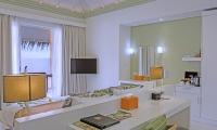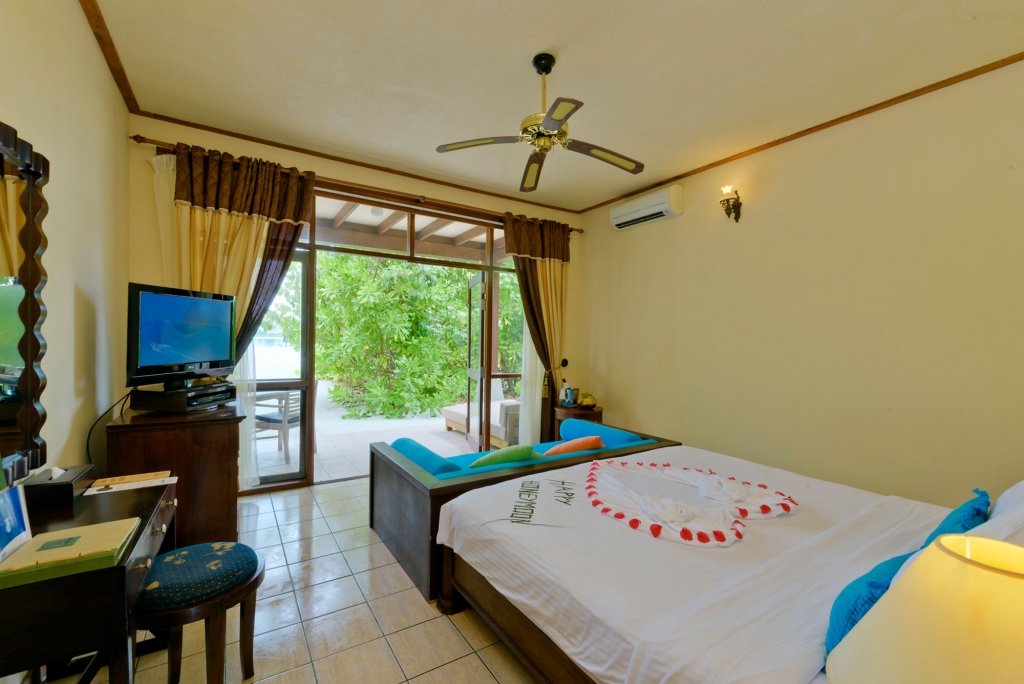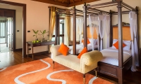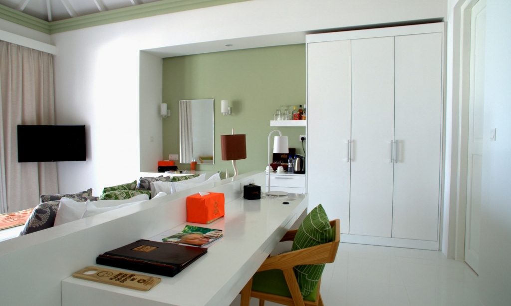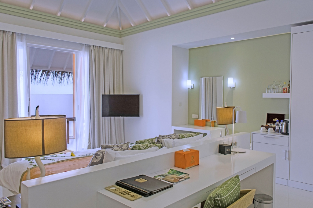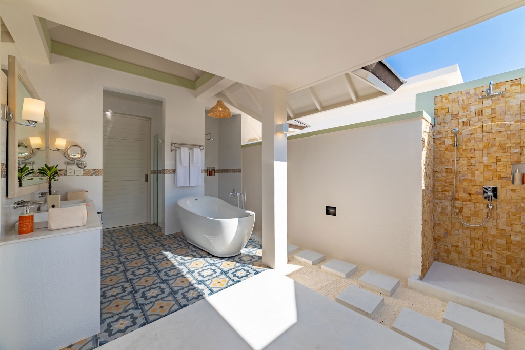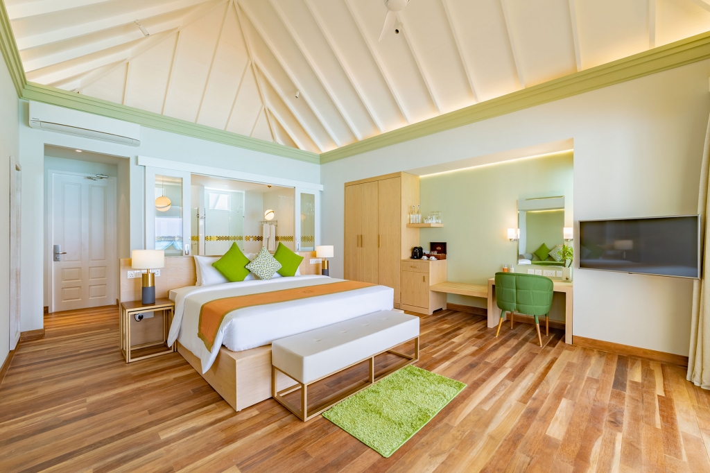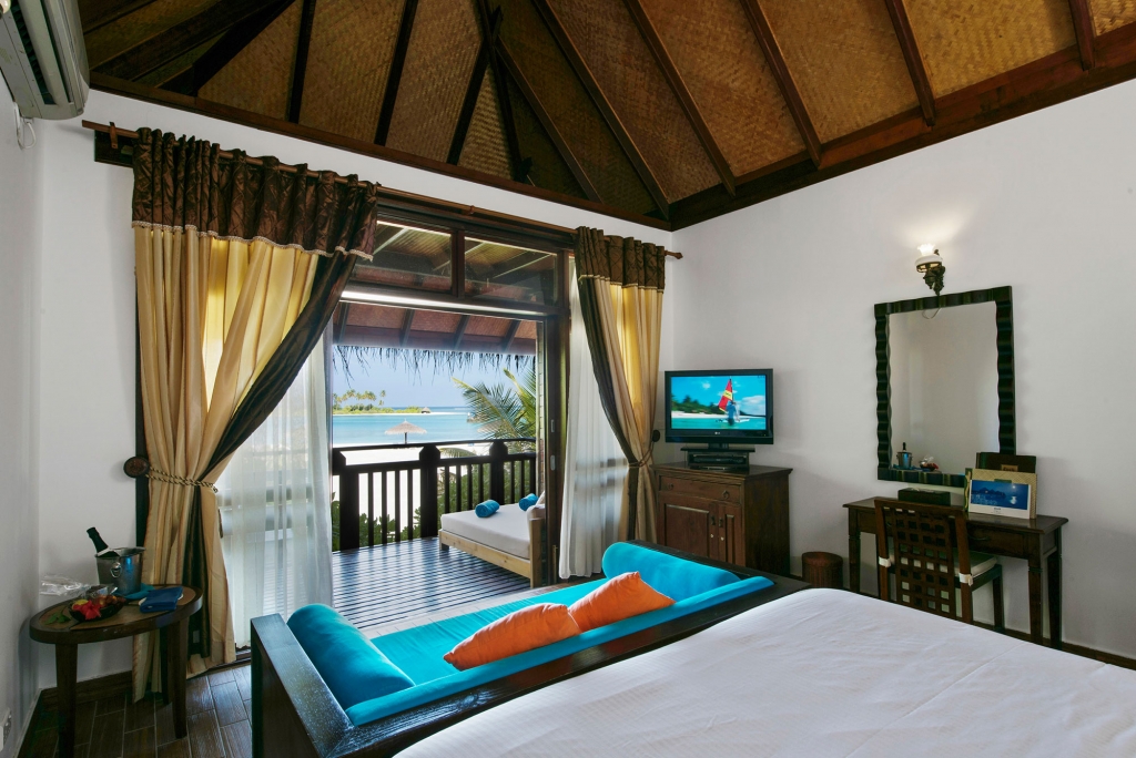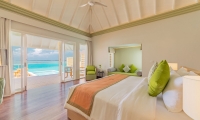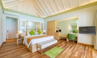 These standard accommodations are anything but standard. Doors open onto a spacious beachfront terrace or panoramic balcony, with the warm waters of the lagoon just a few steps away. Inside, a generously proportioned king size bedroom leads to a bathroom, with walk-in shower and dressing area.