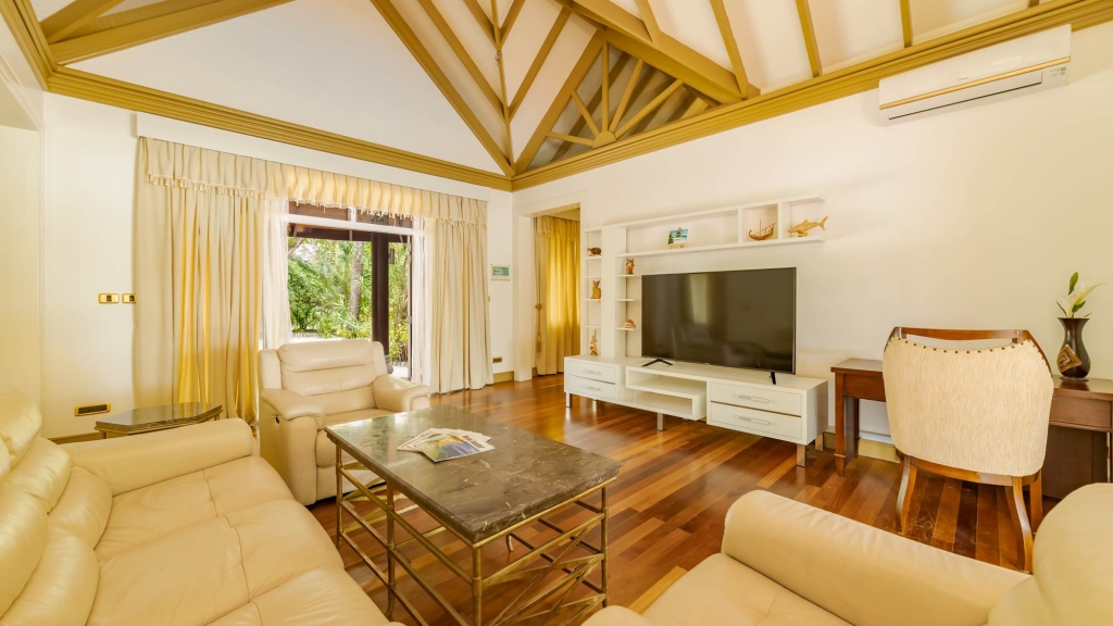 Leave the outside world behind in our Presidential Water Suite, found at the furthest end of the jetty with so much space, you’ll never need to leave. A huge outdoor deck has areas for bathing, dining and relaxing, whilst inside you’ll find two bedrooms, two bathrooms and a large living room with uninterrupted lagoon views.