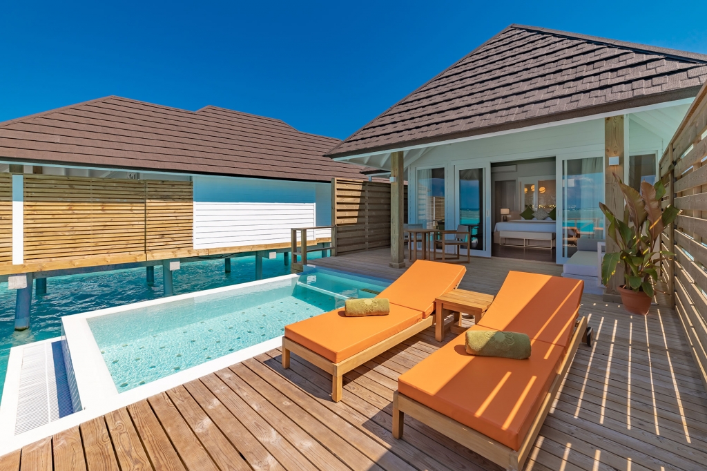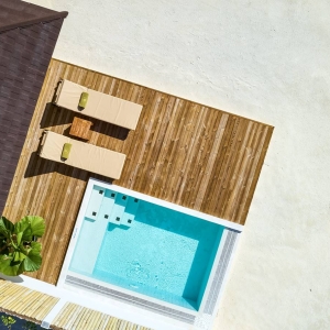 The perfect example of affordable luxury, these villas have a built-in wow factor. Incredibly spacious decks are furnished with an oversized daybed, dining area, sun loungers, a private pool and steps straight down to the lagoon. Inside, the king size bedroom boasts an alcoved daybed and a spectacular bathroom.