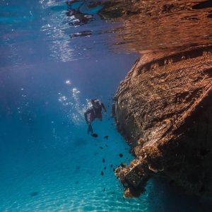 Inside the channel a cave with a swim though at 7 meters displays wonderful scenery when the light shines on the red soldier fishes and tiny fairy basslets.