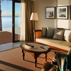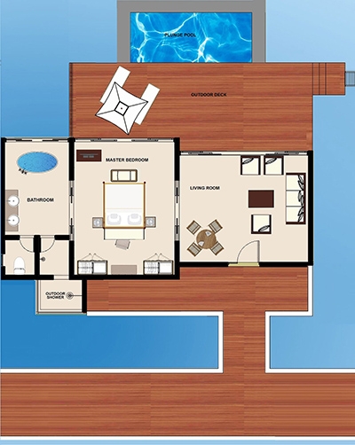 Tucked away in one of the most private locations of the resort, indulge in the luxury of space within a Deluxe Water Pool Villa, heightened by the spectacular feeling of airy openness that enlivens all your senses. Surrender to the pleasure of relaxation within the oversized living room designed to immerse you in absolute comfort while reading or unwinding on the sofa, or contemplating the glorious view