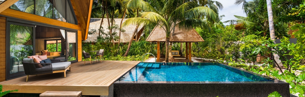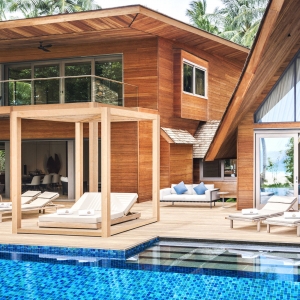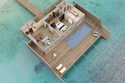 Epitomizing grandeur, each Two-Bedroom Family Beach Villa and Two-Bedroom Family Overwater Villa boasts a winsome furnished terrace with storied ocean views and private pool.