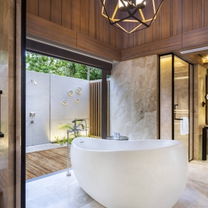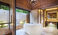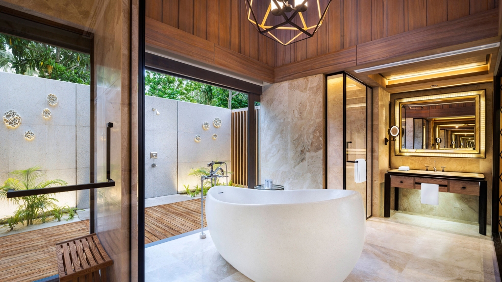 Opening onto the sparkling waters of the villa’s private pool and verdant garden, the terrace is beautifully appointed with a plush daybed and sun loungers. An inviting wooden gazebo with a bench swing offers a romantic sitting area. Meanwhile, floor-to-ceiling glass doors suffuse the indoor space with natural light as lofty wood ceilings accentuate the suite’s airy ambiance. Adorned with contemporary lighting features, the suite features rich mahogany floors balancing an island-inspired palette of cream, sand, turquoise, and gold.