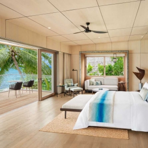 Breezy and inviting, the terrace boasts a 16-square-meter private plunge pool framed by sun loungers and a plush daybed. A wooden gazebo provides a romantic sitting area while four overwater hammocks invite guests to soak up the tropical sun. Visible through towering sliding glass doors, the terrace adjoins a flawless living room elevated by rich mahogany floors. The perfect setting for an intimate meal, the open floor plan features a refined dining table that seats four. State-of-the-art technology includes a Bang & Olufsen 55-inch LCD television and sound system as well as iPad room controls. An elegant writing desk enhanced with multimedia connectivity provides a comfortable workspace. A guest powder room is conveniently located off the living room.