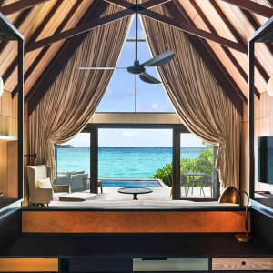 Overlooking Vommuli’s white-sand beaches and the ocean’s azure waves, the ample wooden terrace is immaculately furnished with a plush daybed and sun loungers. A 16-square-meter private plunge pool invites guests to enjoy a refreshing dip. Natural light through floor-to-ceiling glass doors brightens the indoor space. Mahogany ceilings and floors harmonize with a winsome palette of cream, sand, turquoise, and gold.