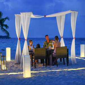 Relax under the stars as they fill the night sky with a romantic private dining experience set on one of Vommuli Island’s pristine white sand beaches, and surrounded with illuminating candlelight and festive lanterns all with your toes in the sand. With the soothing sounds of the waves crashing along the shoreline, enjoy one of the three beach barbecue style menus.