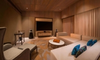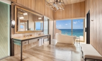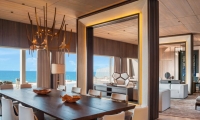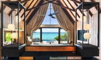 Commanding riveting vistas of the Indian Ocean, the ground-floor terrace boasts a 67-square-meter private swimming pool framed by comfortable sun loungers and a plush daybed. Sliding-glass doors open onto the terrace from the impeccably designed living room, where a plush sofa and armchair invite guests to partake in the premier views. State-of-the-art technology includes a Bang & Olufsen 55-inch LCD television and sound system as well as iPad room controls. Meanwhile, a splendid breakfast bar serviced by a fully-stocked show kitchen promises memorable meals for six.