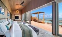 Visible through elegant glass sliding doors, the expansive outdoor terrace frames a 16-square-meter private plunge pool and provides direct access to the ocean. A plush daybed, sun loungers, and four overwater hammocks are ideal for relaxing beneath the Maldivian sun.