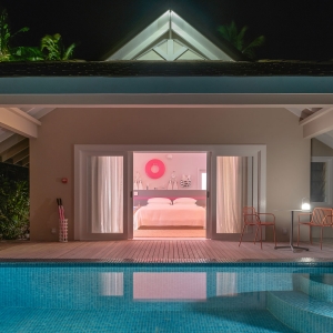 The dreamy, 2 Bedroom Ocean Beach Villa gives groups a little bit everything. At 306 square meters. This is one of the largest rooms on the property features white sand beaches and starry nights.
